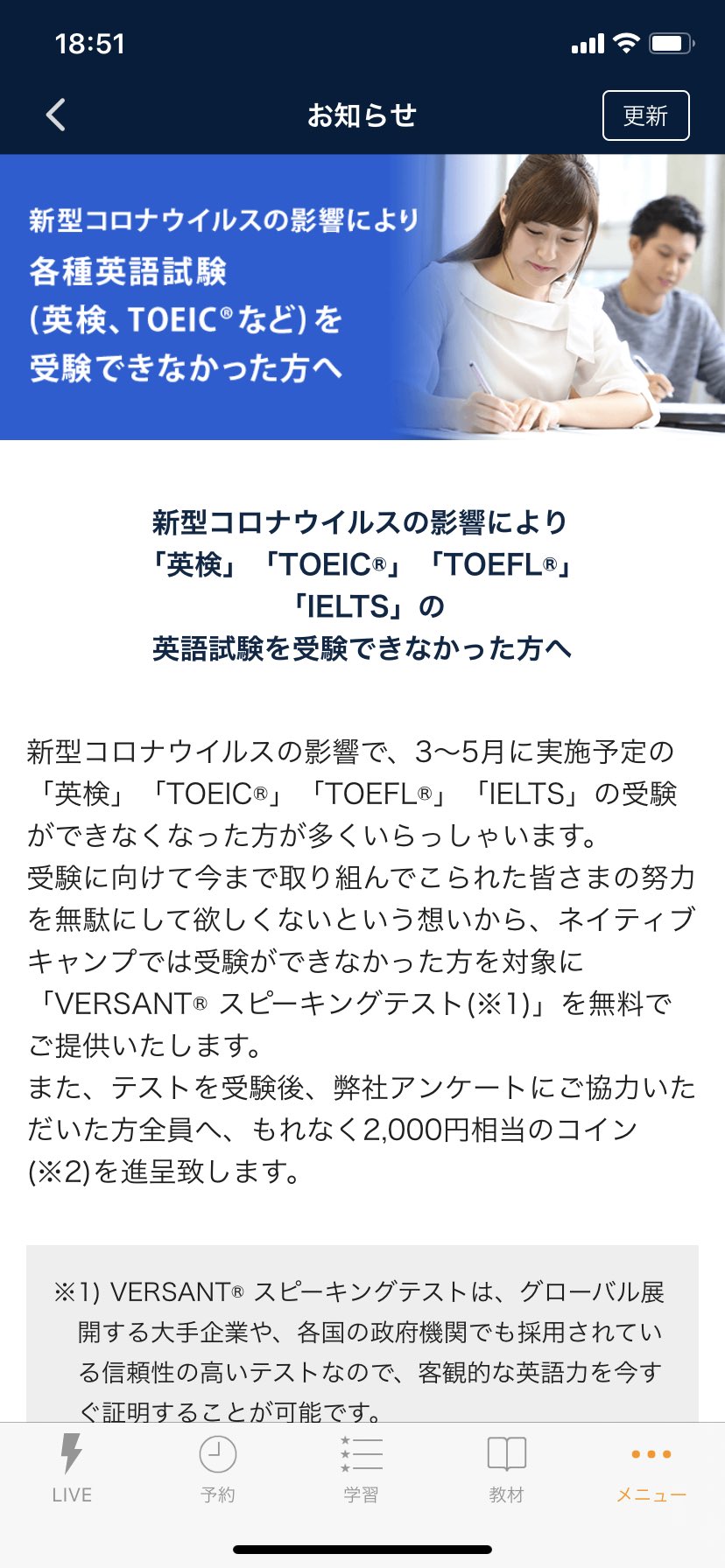 オンライン英会話主婦クマコ V Twitter どういうことだろ Versant 無料で受けられるってこと 英語の試験申し込みしたが 受けられなかった人が対象ってどうやってチェックするんだろう そして 私は申し込みボタンがアクティブでないので試験に取り組んでない人っ